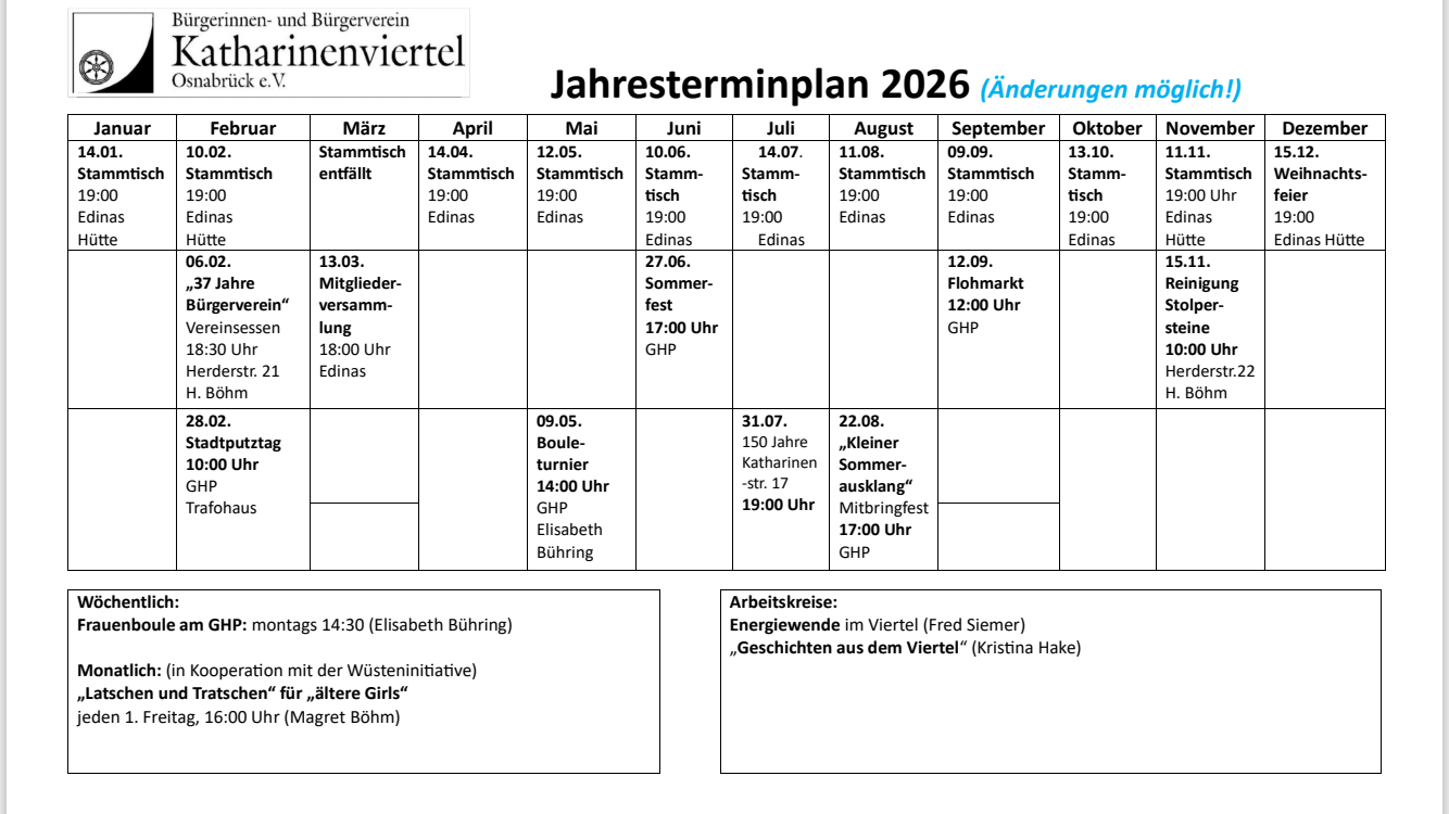 Seit März 2023 gibt es unseren monatlichen Stammtisch „Treffpunkt Katharinenviertel“. Gäste sind jederzeit herzlich willkommen. Neue Ideen sowieso, denn uns interessiert alles, was Euch bewegt, was Euch umtreibt, was Euch Freude oder Sorgen bereitet.