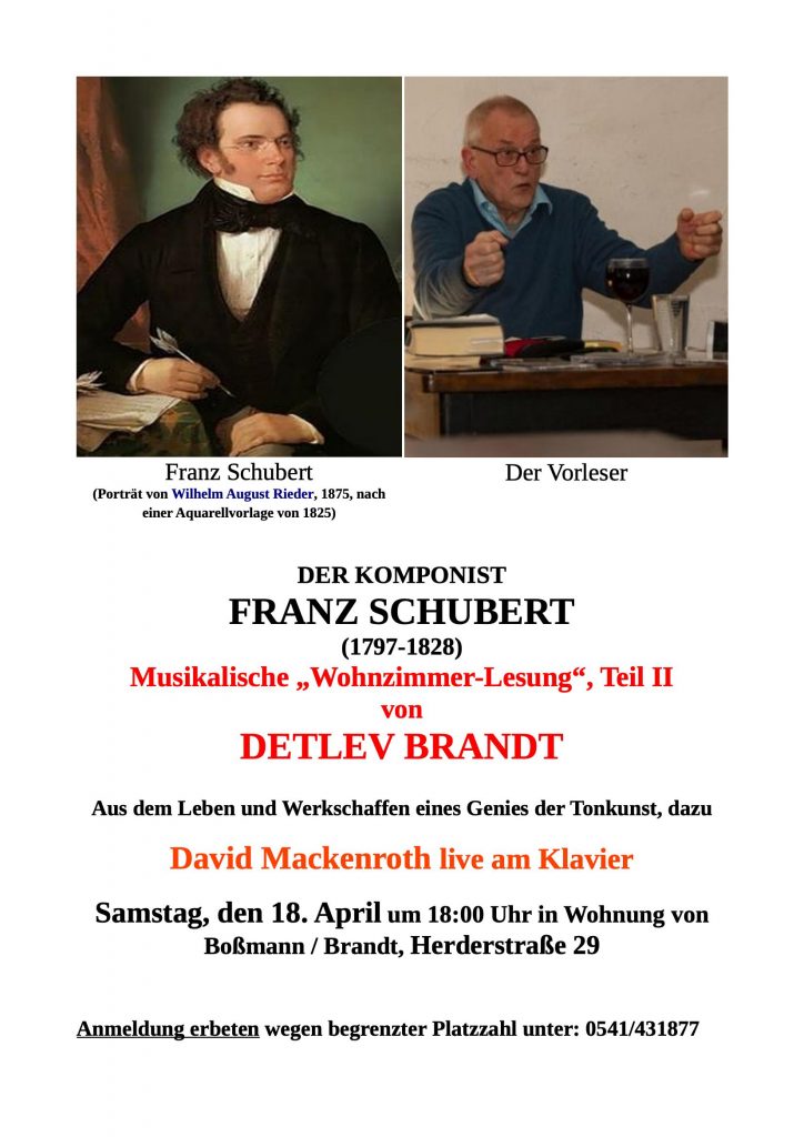 Wegen des großen Erfolges seiner musikalischen Wohnzimmer-Lesung über Franz Schubert hat sich Detlev Brandt dazu entschlossen, zu einem zweiten Teil über das Leben und Wirken von Franz Schubert einzuladen. Dabei wird er auch auf den Einfluß von Ludwig van Beethoven auf ihn eingehen.